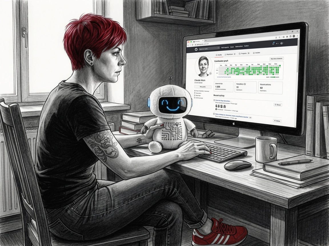 Then you hit mid-level and get really good at this. You write clean code. You know the patterns. You can architect elegant solutions. You take pride in the quality of what you ship. This is where it feels right. You’re a craftsperson. Your GitHub activity graph is a thing of beauty, deep green fields of your worthiness.