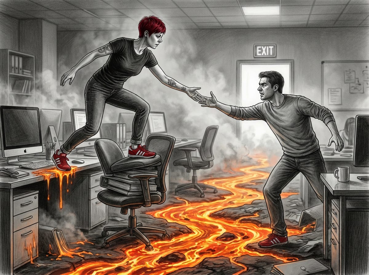 Not everyone gets there. And when they don’t, something shifts after enough of these sessions. Remember that childhood game where the floor is lava and you have to cross the room without touching it? Same principle here, just different consequences. Certain topics become lava. Booking time with them becomes lava. The conversation that should happen gets rerouted through someone else, or dropped entirely. The next meeting runs unusually smooth. Nobody raises anything. The leader thinks: good, we’re aligned. No complaints. Progress.