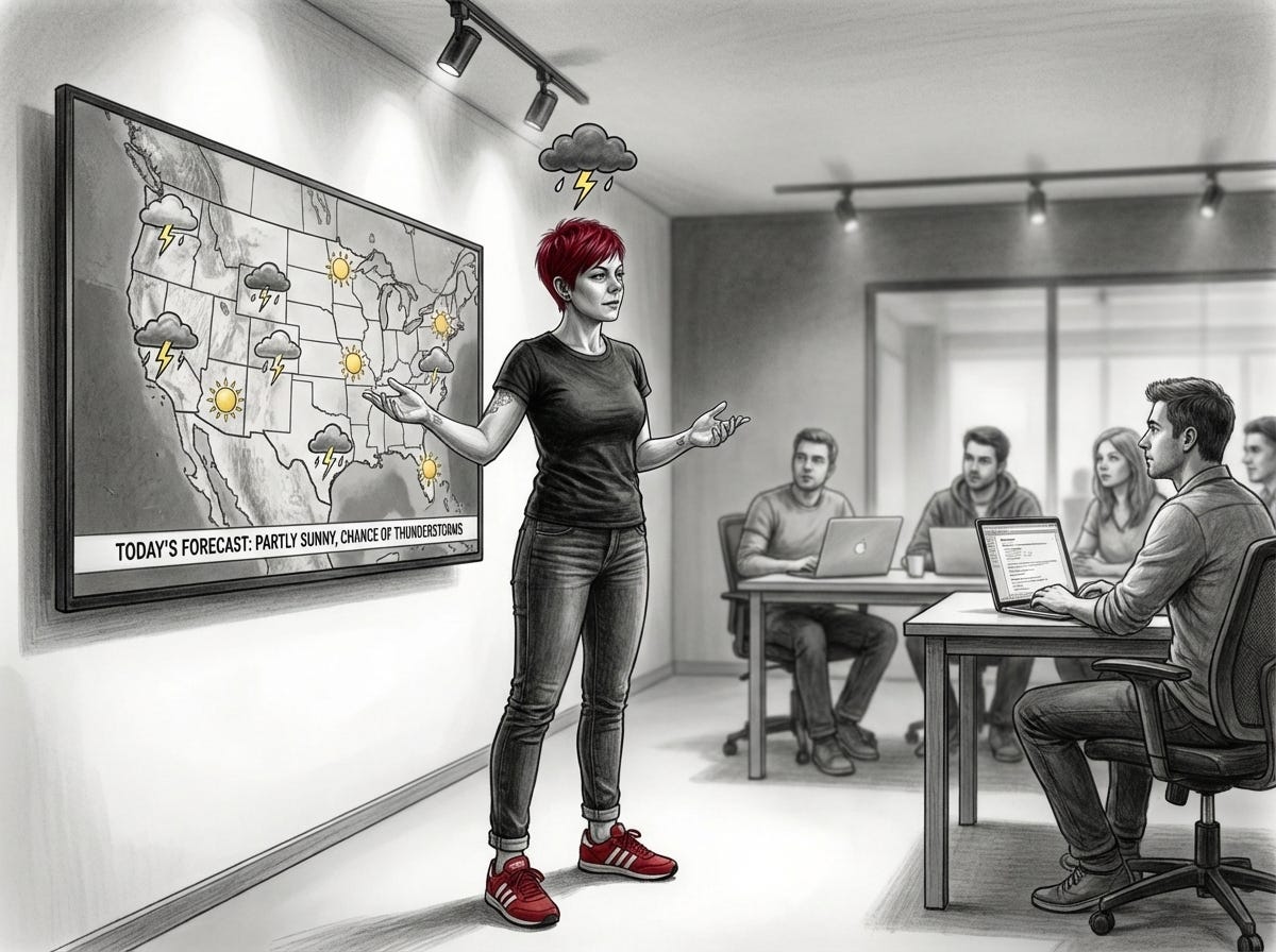 This is weather. The team didn’t cause this. They can’t fix it. They just have to live in it for the rest of the day. And he has no idea. Which is actually the worst version of this. At least if you know you’re doing it, you can do something about it. This is the kind where the leader goes home thinking it was a perfectly normal day.